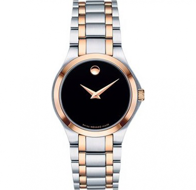 Silver-tone and rose gold-tone stainless steel form a distinctive bi-level bracelet framing a signature black museum dial for this exquisite Superbuy collection timepiece by Movado