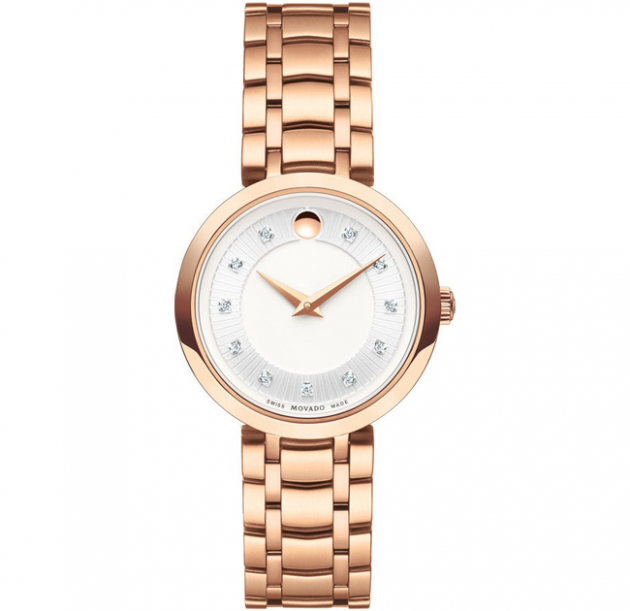 Women’s 1881 quartz watch, 28 mm rose gold PVD-finished stainless steel case, round bi-level silver-toned 2 hand dial with matching dot and hands, and 11 diamond markers (0.042 t.c.w.), brushed and polished rose gold PVD-finished bracelet with chevron-shaped links and push-button deployment clasp.