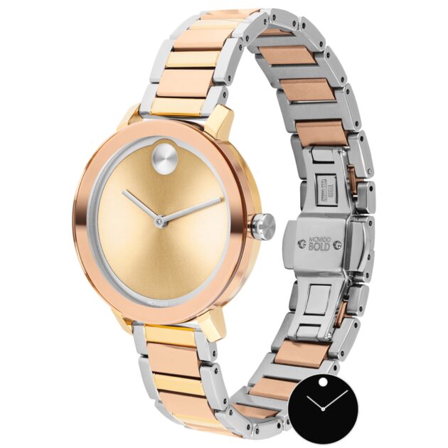 Movado BOLD, vỏ và dây đeo bằng thép không gỉ mạ ion ba màu / vàng hồng / vàng nhạt 34mm với mặt số vàng nhạt và vòng ngoài bằng bạc.