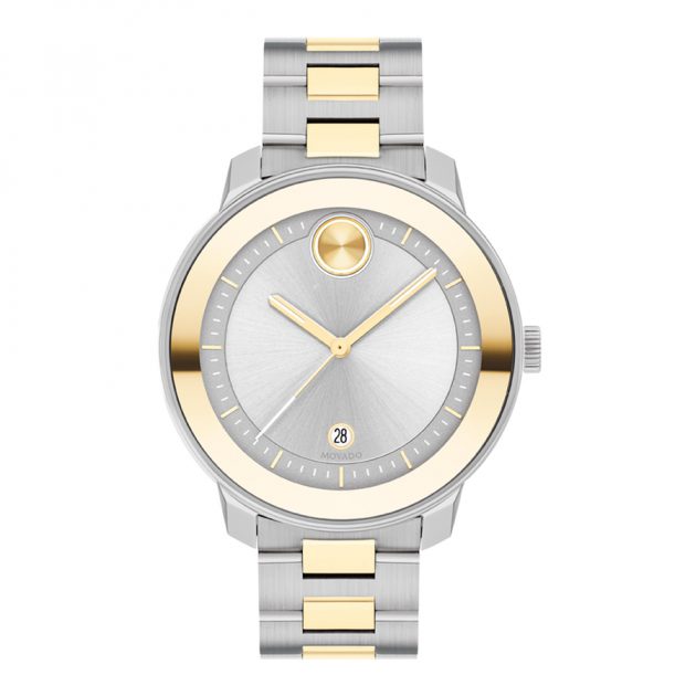 Movado BOLD Verso, vỏ và vòng tay bằng thép không gỉ mạ ion vàng nhạt 38 mm hai tông màu vàng nhạt với mặt số tông bạc. Có các điểm nhấn màu vàng nhạt màu vàng nhạt, chi tiết cửa sổ ngày và theo dõi phút.