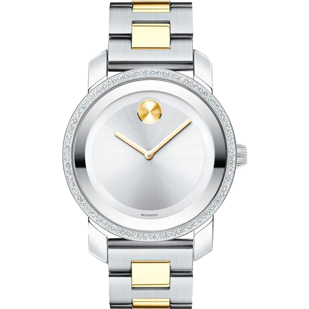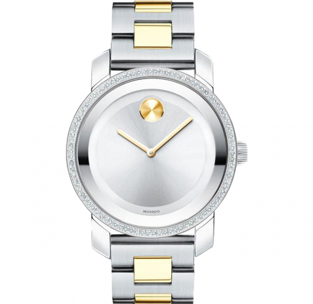 Mid-size Movado BOLD Diamond watch, 36 mm stainless steel case with 90-diamond bezel (0.378 t.c.w.), silver-toned sunray dial with matching sunray dot and hands, stainless steel and yellow gold ion-plated stainless steel link bracelet with deployment clasp, K1 crystal, Swiss quartz movement, water resistant to 30 meters.