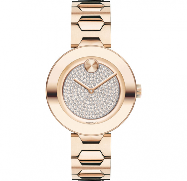 Mid-size Movado BOLD watch, 32 mm pink gold ion-plated stainless steel case, K1 crystal with a ring of highly reflective pink gold-toned metallization, crystal pave dial with gold-toned dot and hands, pink gold ion-plated stainless steel T-bar link bracelet with push-button deployment clasp.