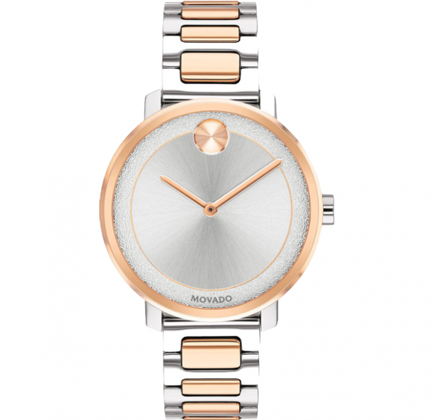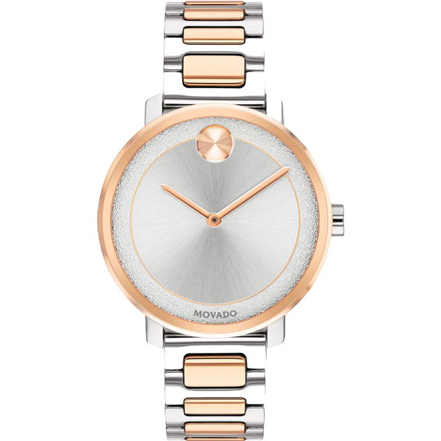 Mid-size Movado BOLD watch, 34 mm stainless steel and rose gold ion-plated case, K1 crystal, silver-toned dial with matching frosted-textured outer ring, rose gold-toned dot and hands, two-toned stainless steel link bracelet with push-button deployment clasp.