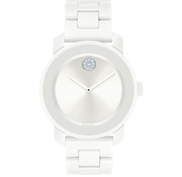 Mid-size Movado BOLD watch, 36 mm white ceramic and stainless steel case, K1 crystal with a ring of highly reflective white-toned metallization, silver white dial with clear crystal-set dot and white-toned hands, white ceramic and stainless steel link bracelet with push-button deployment clasp.