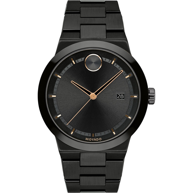 Movado BOLD Fusion, 42mm black ion-plated stainless steel case and bracelet with a black ceramic bezel & black-toned dial.