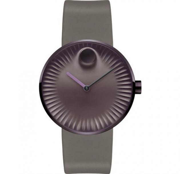Men’s Movado Edge watch, 40 mm coffee ion-plated stainless steel case, concave sandblasted purple aluminum dial with raised polished tonal dot, sculpted ray-textured edge, matte light purple hour hand and polished black minute hand, smokey purple silicone strap with coffee ion-plated stainless steel buckle.