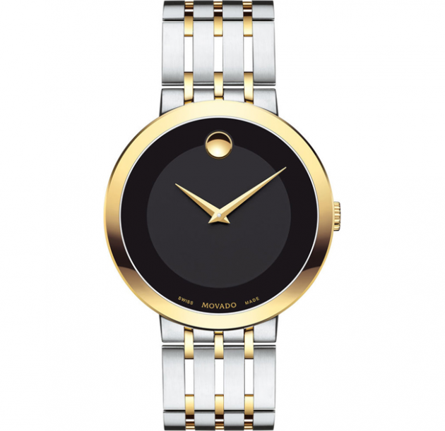 Stainless steel case with a two-tone (silver and gold PVD) stainless steel bracelet. Fixed gold PVD bezel. Black museum dial with gold-tone hands. The Movado dot marks the 12 o’clock position.