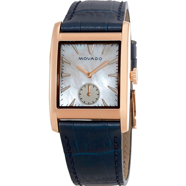 Rose gold-tone stainless steel case with a blue leather strap. Fixed rose gold-tone stainless steel bezel. White mother of pearl dial with rose gold-tone hands and index hour markers. Minute markers around the outer rim. Dial Type: Analog. Luminescent hands and markers. One – small second subdial.
