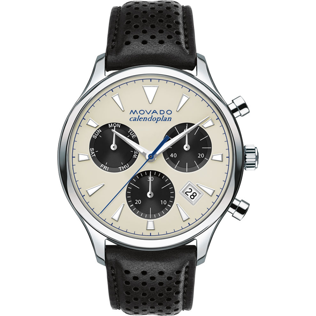 Men’s Movado Heritage Series Calendoplan chronograph, 43 mm stainless steel case; round parchment-colored dial with luminescent silver-toned hour/minute hands/applied markers, black subdials (day/minute counter/small seconds), blue seconds hand and printed minute index, date display; top-stitched perforated black leather strap, classic stainless steel buckle.