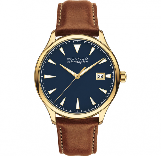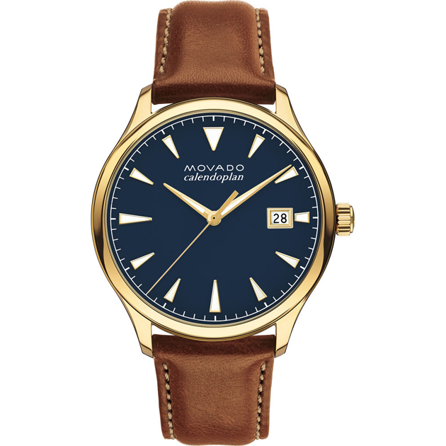 Men’s Heritage Series Calendoplan watch, 40 mm yellow gold ion-plated stainless steel case with fluidly extended lugs; navy lacquer 3-hand dial with luminescent yellow gold-toned hands and applied markers, printed white minute index, and date display; top-stitched cognac leather strap with classic yellow gold ion-plated steel buckle.