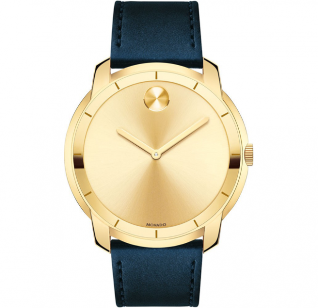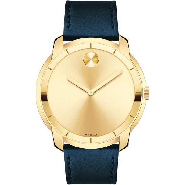 Large Movado BOLD watch, thin 44 mm yellow gold ion-plated stainless steel case, K1 crystal with a ring of gold-toned metallization with gold-toned hour index, gold-toned sunray dial with matching sunray dot and hands, navy leather strap with matching top-stitching, stainless steel buckle.