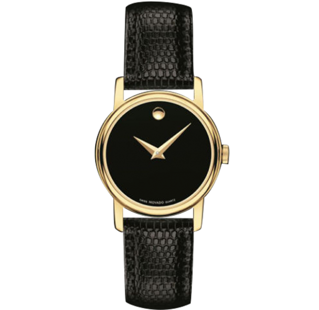 Gold-plated stainless steel case with a black leather strap. Fixed gold-plated bezel. Black dial with gold-tone hands. The Movado dot appears at the 12 o’clock position.
