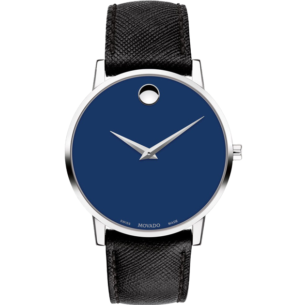 Men’s Museum Classic watch, 40 mm stainless steel case, blue Museum dial with silver-toned dot and hands, black leather strap with stainless steel buckle.