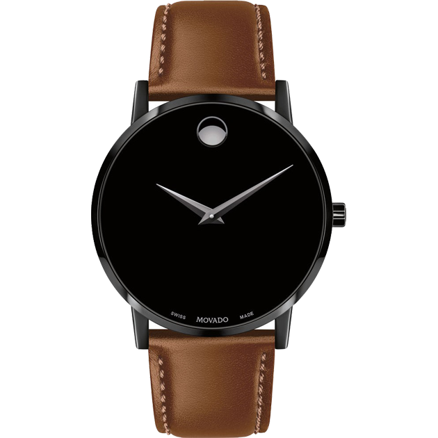 Men’s Museum Classic watch, 40 mm black PVD-finished stainless steel case, black Museum dial with silver-toned dot and hands, cognac calfskin strap with black PVD-finished stainless steel buckle.