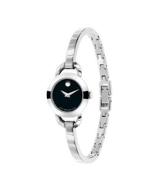 Stainless steel case with a stainless steel bangle bracelet. Fixed stainless steel bezel. Black dial with silver-tone hands. The Movado dot marks the 12 o’clock position.