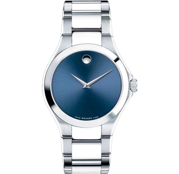 Stainless steel case with a stainless steel bracelet. The Movado dot marks the 12 o’clock position. Scratch resistant sapphire crystal.