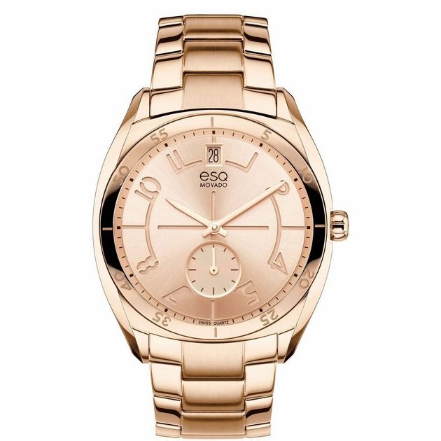 Start your style evolution with the perfect accessory. This rosy Origin collection watch from esQ Movado creates a lovely look. Rose-gold ion-plated stainless steel bracelet with logo-engraved deployment clasp. Tonneau-shaped case, 36mm, engraved bezel, “e” logo crown. Rose-gold-tone dial with numerals, two hands, markers, small seconds subdial and date window.