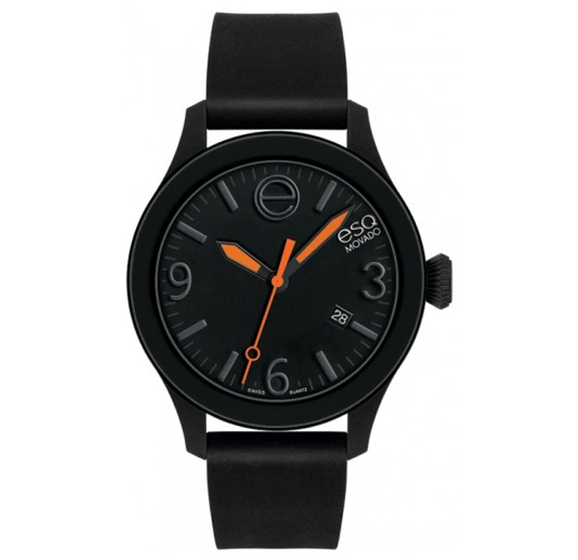 Women’s ESQ Status watch, round 24.5mm yellow gold ion-plated stainless steel case with U-shaped lugs and “e” logo crown. White dial with embossed signature “e” logo pattern, Yellow gold-toned hands and orange circle-tip seconds hand, Yellow gold ion-plated stainless steel bangle bracelet with removable back sizing links and logo-engraved jewelry clasp, Swiss quartz movement, mineral crystal, water resistant to 30 meters.