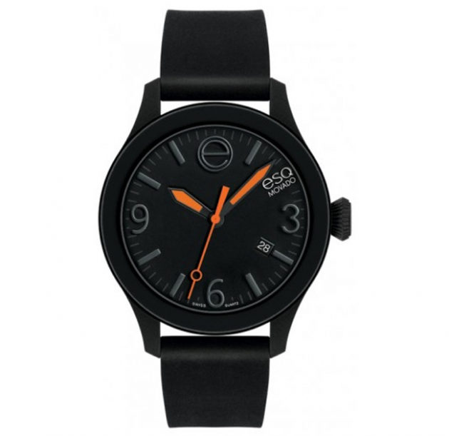 Unisex ESQ One watch, 42.50 mm black silicone-wrapped stainless steel case with screw-down black polycarbonate “e” logo crown, round black dial with black Arabic numerals and index, orange-filled black hands and orange circle-tip seconds hand, long black silicone strap with logo-button keeper and black polycarbonate buckle, Swiss quartz movement, mineral crystal, water resistant to 100 meters.