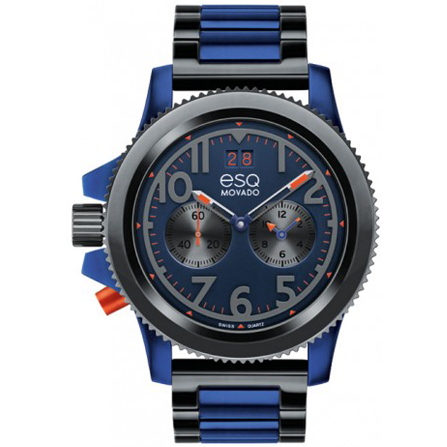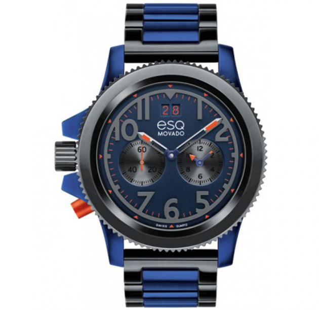 Men’s ESQ Fusion dual-time watch43.2 mm round dark blue aluminum and gray ion-plated stainless steel case with gear edge bezel, and left-side “e” logo crown and orange dual-time pusher,Blue dial with gray small seconds and second time zone subdials.