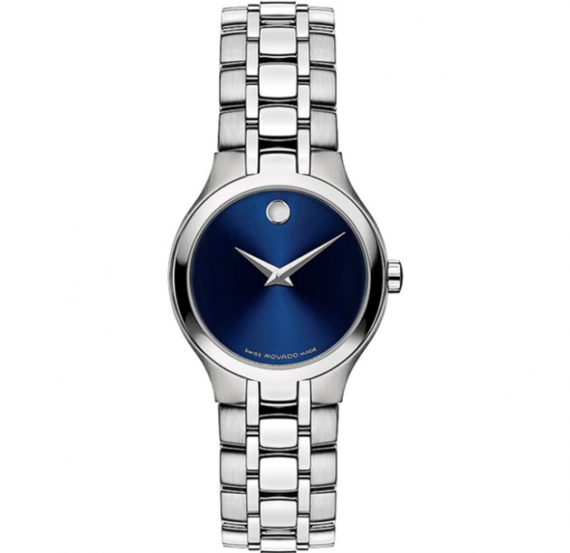 Stainless steel case with a stainless steel bracelet. Blue dial with silver-tone hands. The Movado dot appears at the 12 o’clock position. Scratch resistant sapphire crystal.
