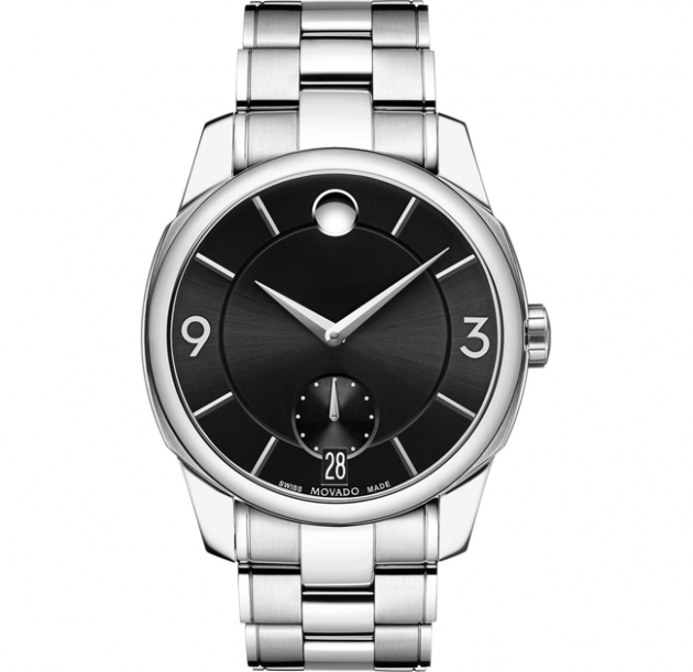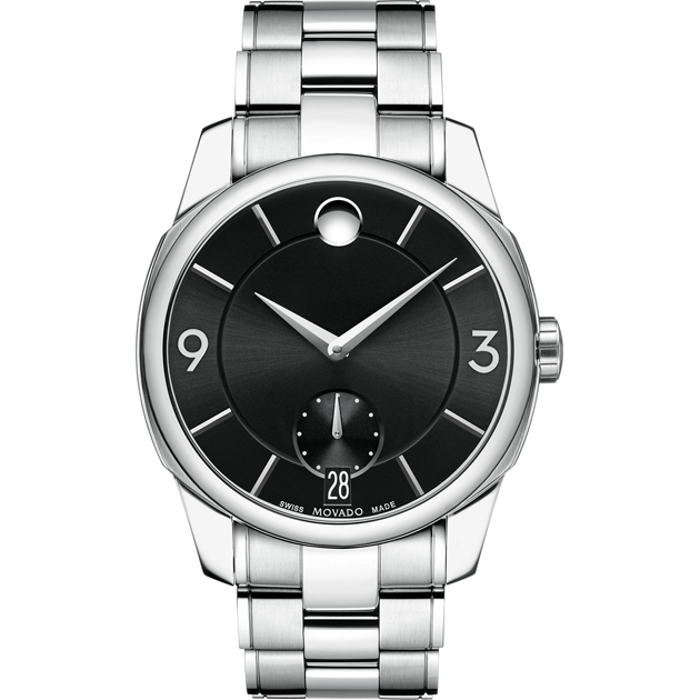 Stainless steel case with a stainless steel bracelet. Fixed stainless steel bezel. Black dial with silver-tone hands and stick hour markers. Arabic numerals mark the 3 and 6 o’clock positions, Movado dot marks the 12 o’clock position. Dial Type: Analog.