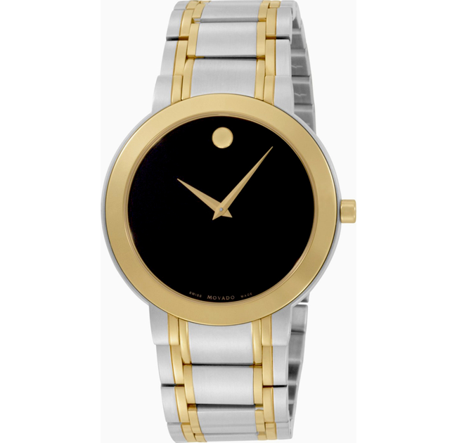 Differing levels of silver-tone and rose gold-tone stainless steel links create a subtly ridged bracelet on this elegant Superbuy timepiece with Movado’s signature museum dial.