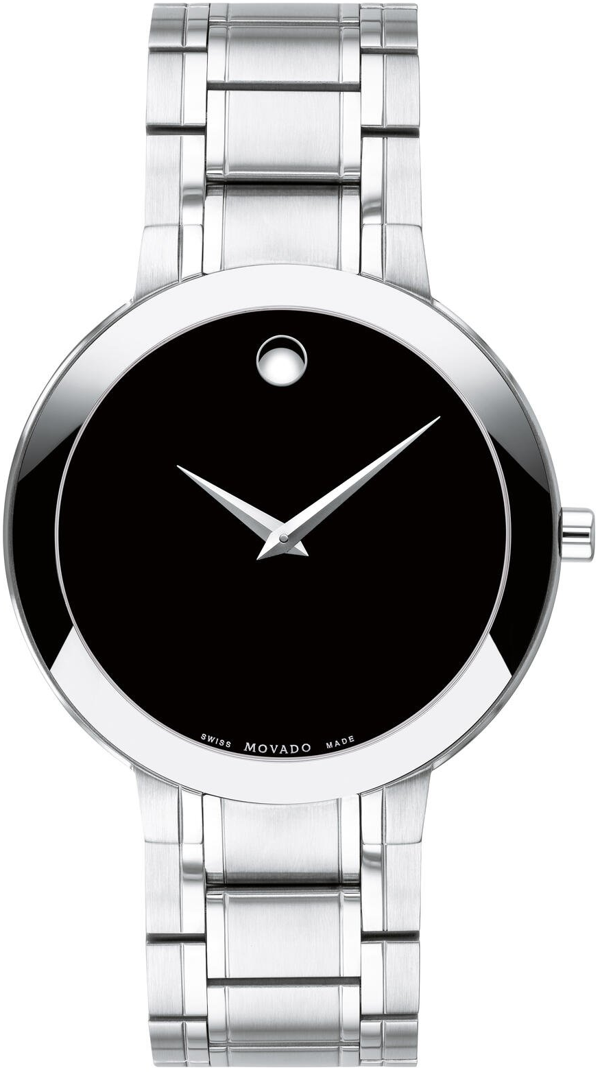 Đồng hồ Movado Stiri, vỏ thép không gỉ 40mm và dây đeo mắt xích có khóa cài, mặt số Museum màu đen có chấm lõm, mặt kính sapphire, bộ máy thạch anh Thụy Sĩ. Khả năng chống nước ở độ sâu 30 mét.