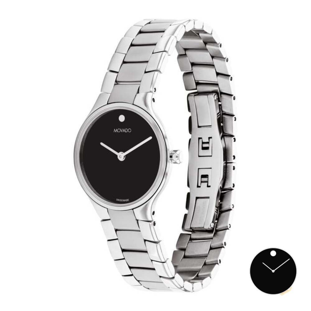 Đồng hồ Movado Serio dành cho nữ, vỏ thép không gỉ 26mm và dây đeo mắt xích có khóa cài, mặt số Museum màu đen, mặt kính sapphire, bộ máy thạch anh Thụy Sĩ