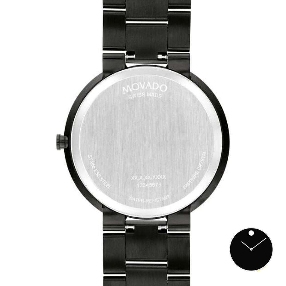 Thiết kế hiện đại bóng bẩy. Đồng hồ Movado Infinio dành cho nam, vỏ và dây đeo bằng thép không gỉ pvd đen 40mm, mặt kính sapphire, bộ máy thạch anh Thụy Sĩ