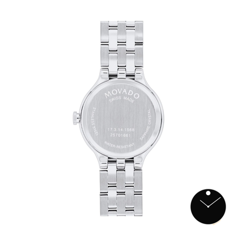 Đồng hồ Movado Veturi dành cho nữ, vỏ thép không gỉ 28mm và dây đeo mắt xích, mặt số Museum màu đen, mặt kính sapphire, bộ máy thạch anh Thụy Sĩ