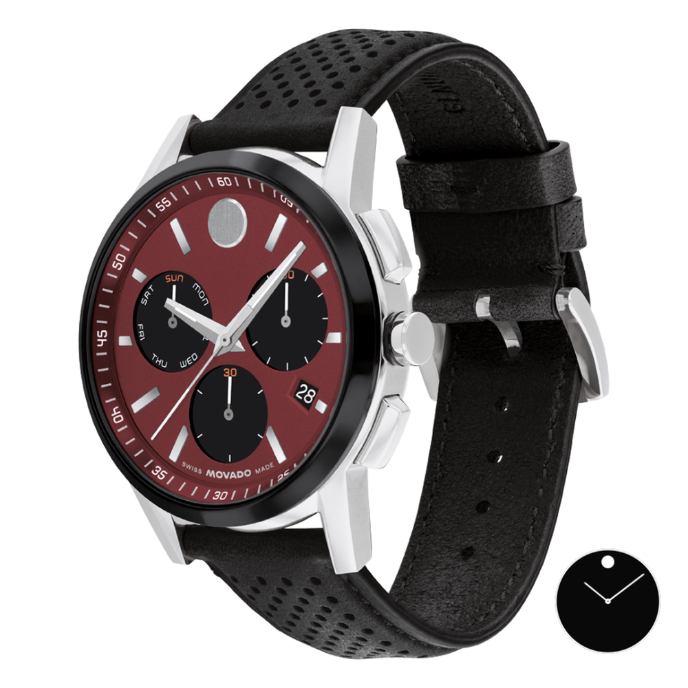 Museum Sport giới thiệu một chiếc đồng hồ bấm giờ tối giản thể thao cho thiết kế mang tính biểu tượng nhất của chúng tôi. Chiếc đồng hồ bấm giờ 43mm này có mặt số kết cấu màu đỏ tía, điểm nhấn Swiss Super-LumiNova® và dấu chấm đặc trưng của chúng tôi ở vị trí 12 giờ. Mặt số màu đỏ với vạch chỉ giờ, Đường kính vỏ 43, Chất liệu vỏ thép không gỉ và thép không gỉ hoàn thiện bằng PVD màu đen, Pha lê Chế tạo Sapphire, Khả năng chống nước 30 mét, Bộ máy Bộ máy bấm giờ thạch anh Thụy Sĩ, Dành cho nam, Dây đeo bằng da bê màu đen.