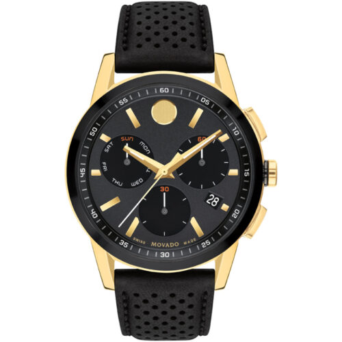 Museum Sport giới thiệu một chiếc đồng hồ bấm giờ tối giản thể thao cho thiết kế mang tính biểu tượng nhất của chúng tôi. Chiếc đồng hồ bấm giờ 43mm này có mặt số có họa tiết màu đen, điểm nhấn Swiss Super-LumiNova® và dấu chấm đặc trưng của chúng tôi ở vị trí 12 giờ. Mặt số màu đen với vạch chỉ giờ, Đường kính vỏ 43, Chất liệu vỏ hoàn thiện bằng PVD màu vàng và hoàn thiện bằng PVD màu đen, Pha lê Chế tác Sapphire, Khả năng chống nước 30 mét, Bộ máy Bộ máy bấm giờ thạch anh Thụy Sĩ, Dành cho nam, Dây đeo bằng da bê màu đen.