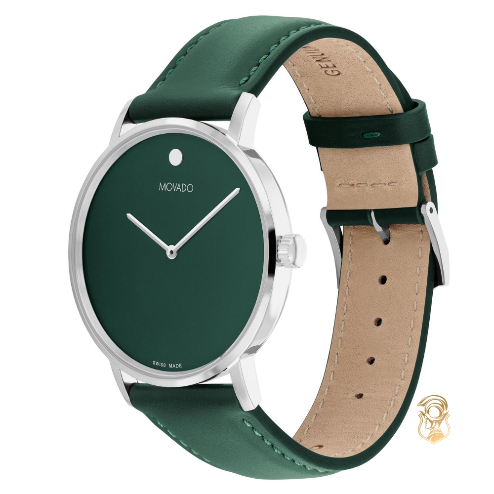 Biểu tượng của thiết kế hiện đại. Đồng hồ Movado Signature, vỏ thép không gỉ 40mm, mặt số xanh lá cây, dây da xanh lá cây, mặt kính sapphire, bộ máy thạch anh Thụy Sĩ. Mặt số màu xanh lá cây đậm, họa tiết Museum với chấm tròn phẳng. Đường kính vỏ 40. Chất liệu vỏ: thép không gỉ. Mặt kính: Sapphire. Khả năng chống nước: 30 mét. Bộ máy: Bộ máy thạch anh Thụy Sĩ. Dành cho cả nam và nữ. Dây đeo dạng vòng tay.
