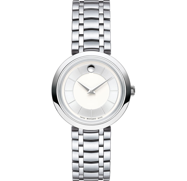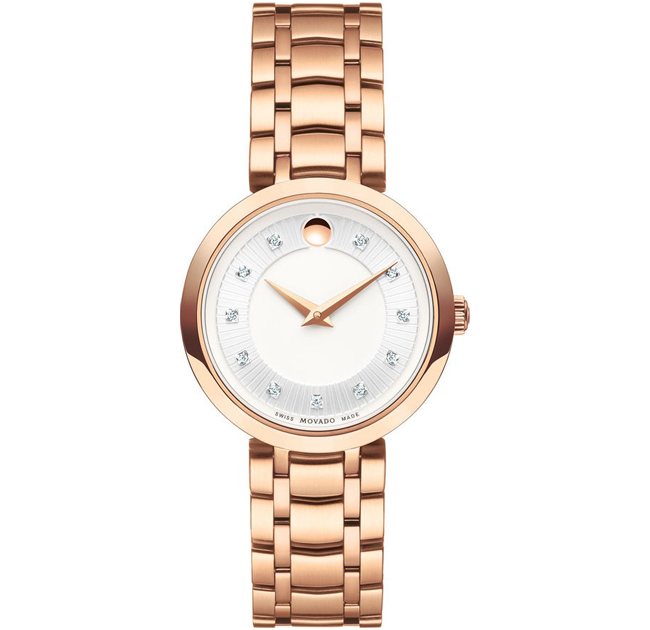Women’s 1881 quartz watch, 28 mm rose gold PVD-finished stainless steel case, round bi-level silver-toned 2-hand dial with matching dot, hands and stamped hour markers, brushed and polished two-toned stainless steel bracelet with chevron-shaped links and push-button deployment clasp.
