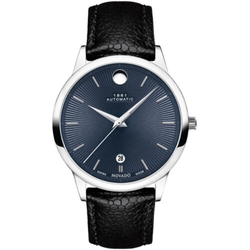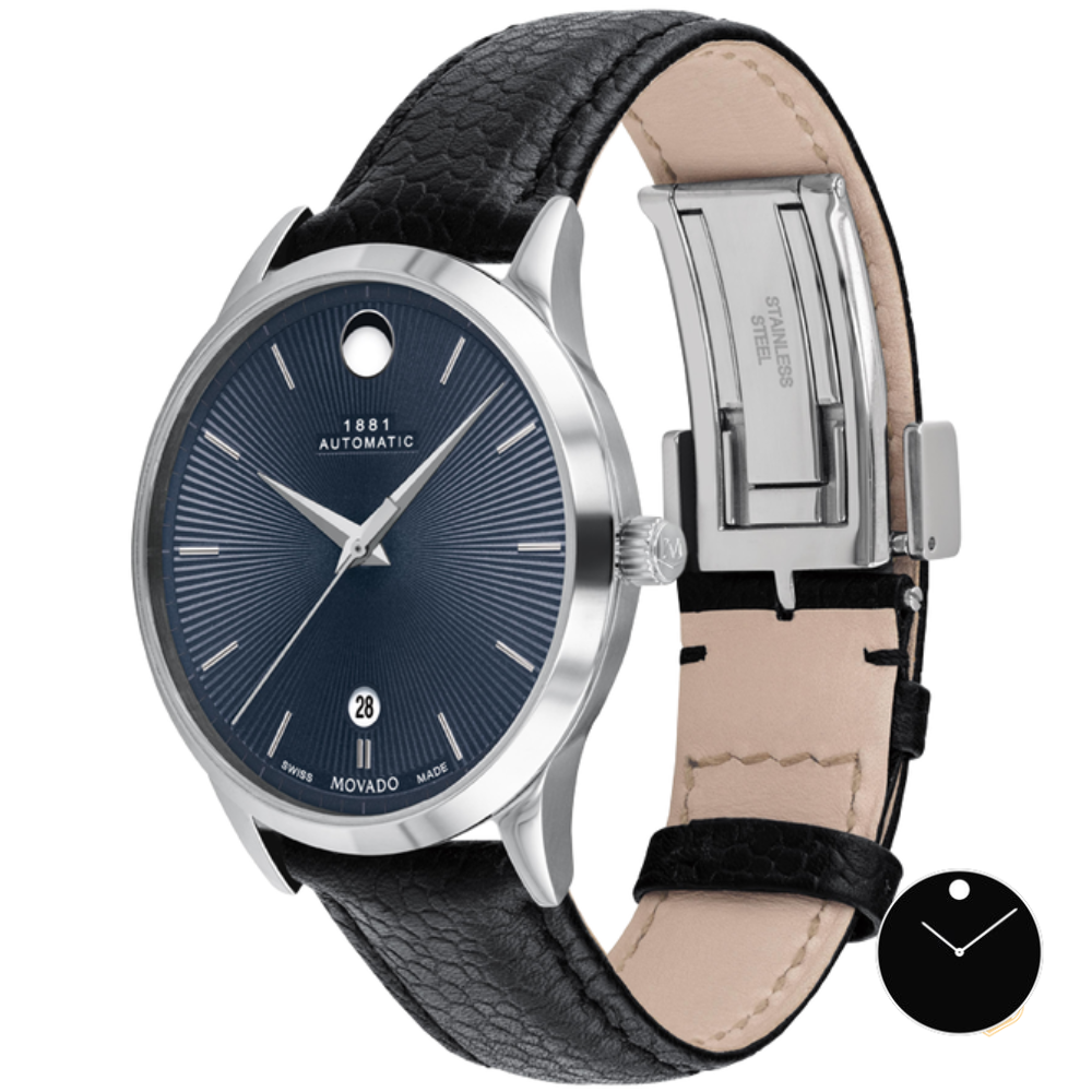 Movado 1881 Automatic, vỏ thép không gỉ 39mm với mặt số có họa tiết màu xanh và dây đeo bằng da bê màu đen. Mặt sau có bộ máy tự động lộ ra. Đồng hồ tự động không chứa pin. Chúng được sạc bằng chuyển động của cổ tay bạn. Nếu không đeo đồng hồ, đồng hồ sẽ ngừng chạy sau khoảng 38 giờ. Để bắt đầu, hãy xoay núm điều chỉnh theo chiều kim đồng hồ khoảng 20-30 lần cho đến khi kim giây bắt đầu di chuyển. Rất có thể bạn sẽ cần đặt lại thời gian và ngày.