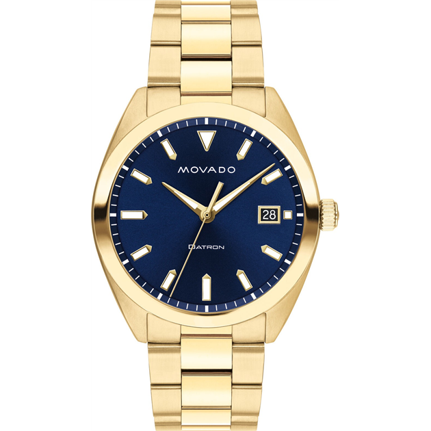 Movado 1881 Automatic, 39mm yellow gold PVD-finished stainless steel case with black textured dial and black calfskin leather strap. Caseback features an Exposed Automatic Movement.