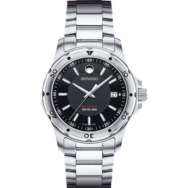 Black dial enhanced by luminous hands. Silver-tone stainless steel case with a silver-tone stainless steel band. Quartz movement. 200 meters / 660 feet water resistance. Uni-directional Rotating bezel. Scratch Resistant Sapphire crystal. Solid caseback. Deployment clasp. Screw Down crown. Case size 40 mm x 10 mm. Band 21 mm x long. Movado 2600074 Series 800 Watch.