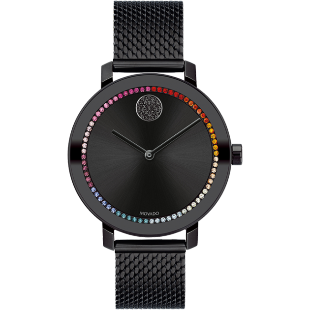 Movado BOLD Evolution, 34 mm black ion-plated stainless steel case and mesh bracelet with a black-toned dial featuring a rainbow crystal outerzone & crystal set dot.