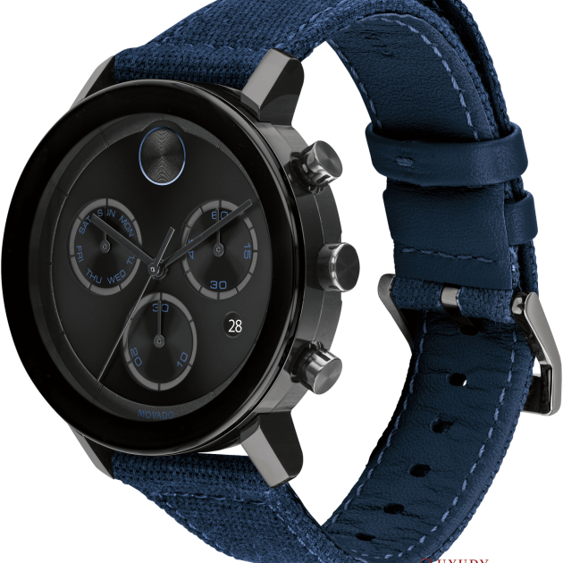Movado Bold Evolution, vỏ thép không gỉ mạ ion đen 42mm với mặt số chronograph màu đen trên dây đeo bằng vải sáp màu xanh nước biển.