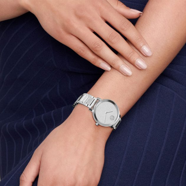 Movado Bold Evolution, vỏ và vòng tay bằng thép không gỉ 34 mm với mặt số lấp lánh màu bạc và chấm pha lê.