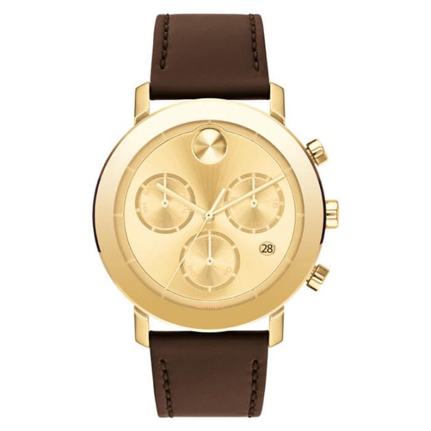Movado BOLD Evolution, 42mm pale yellow gold ion-plated stainless steel case with pale yellow gold chronograph dial on a chocolate brown leather strap.
