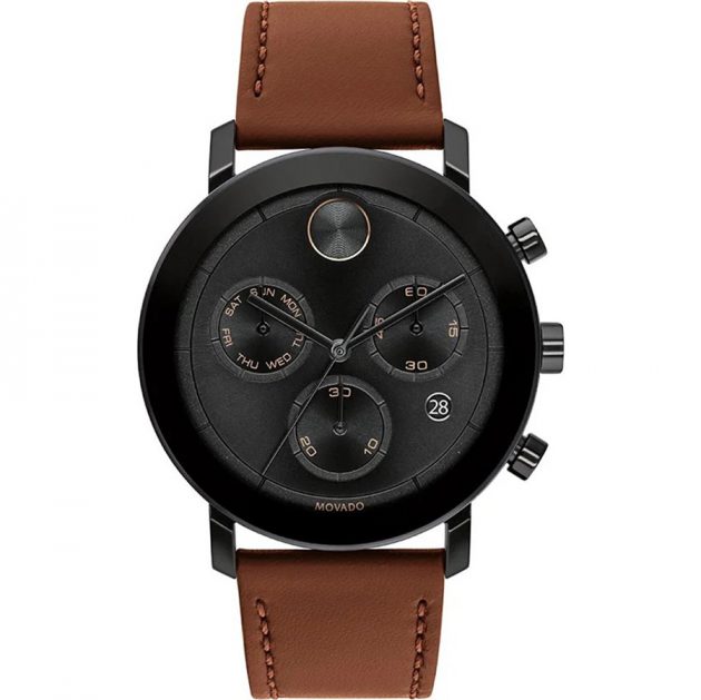 Đồng hồ nam Movado BOLD Evolution có vỏ thép không gỉ mạ ion đen 42mm với mặt số chronograph màu đen và chi tiết cửa sổ ngày. Dây đeo bằng da màu nâu cognac được cố định chắc chắn bằng khóa cài.