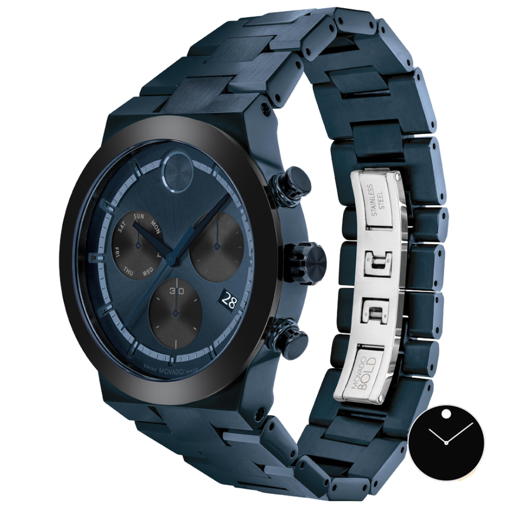 Movado BOLD Fusion, vỏ và dây đeo bằng thép không gỉ mạ ion màu xanh lam 44mm với mặt số chronograph màu xanh lam và đen, vành gốm và chi tiết cửa sổ ngày.