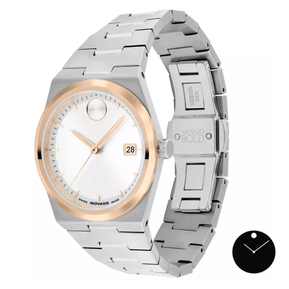 Nắp lưng dạng khóa bấm. Kiểu vành trơn. Hình dạng đồng hồ Tròn. Phong cách Cổ điển, Trang trọng/Trang trọng. Tính năng Mặt số 12 giờ, Chống nước. Kích thước vỏ 35 mm. Vỏ thép không gỉ. Chống nước 5 ATM. Bộ máy Quartz. Thương hiệu Movado. Màu dây đeo Bạc. Màu mặt số Bạc/Vàng hồng. Quốc gia/Khu vực sản xuất Thụy Sĩ