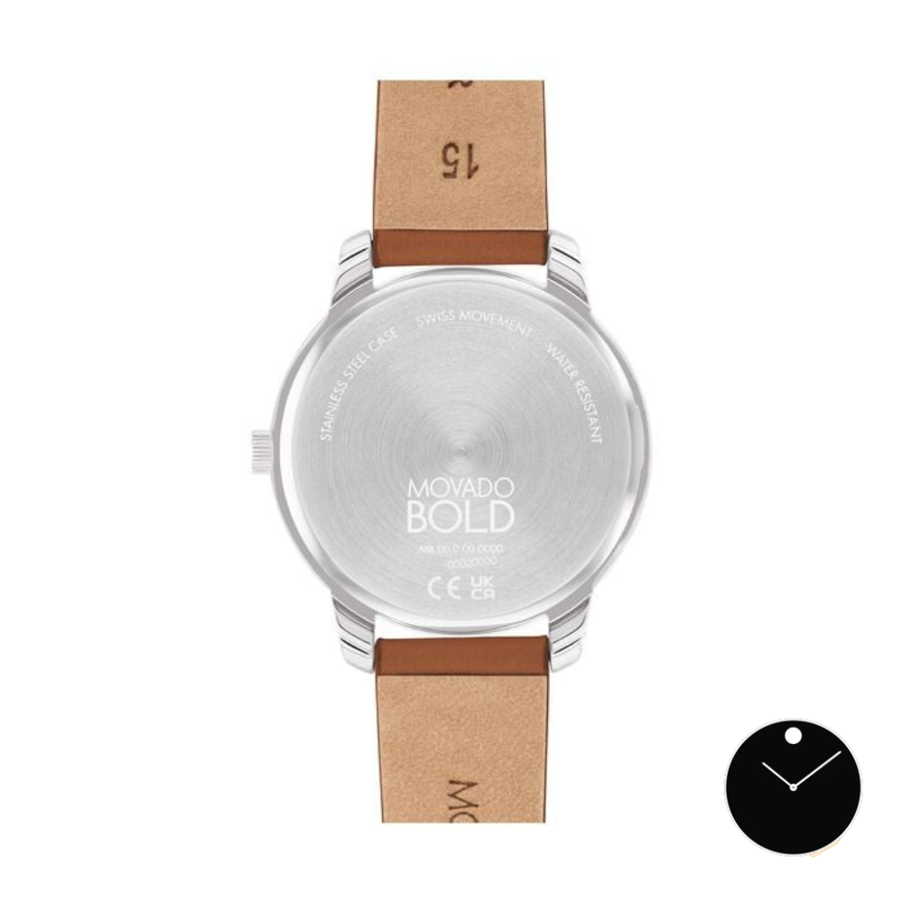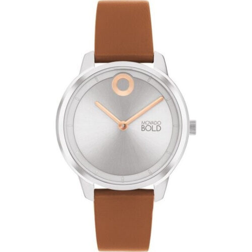 Gặp gỡ thời gian với thái độ hiện đại trong thiết kế phải có này với dây đeo bằng da sang trọng. Movado Trend Element dành cho nữ, vỏ thép không gỉ 34mm và dây đeo bằng da màu cognac, mặt số màu bạc, tinh thể khoáng K1, Bộ máy Thụy Sĩ