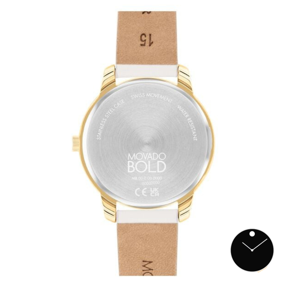 Gặp gỡ thời gian với thái độ hiện đại trong thiết kế phải có này với dây đeo bằng da sang trọng. Movado Trend Element dành cho nữ, vỏ PVD vàng vàng 34mm và dây đeo bằng da trắng, mặt số vàng, tinh thể khoáng K1, Bộ máy Thụy Sĩ