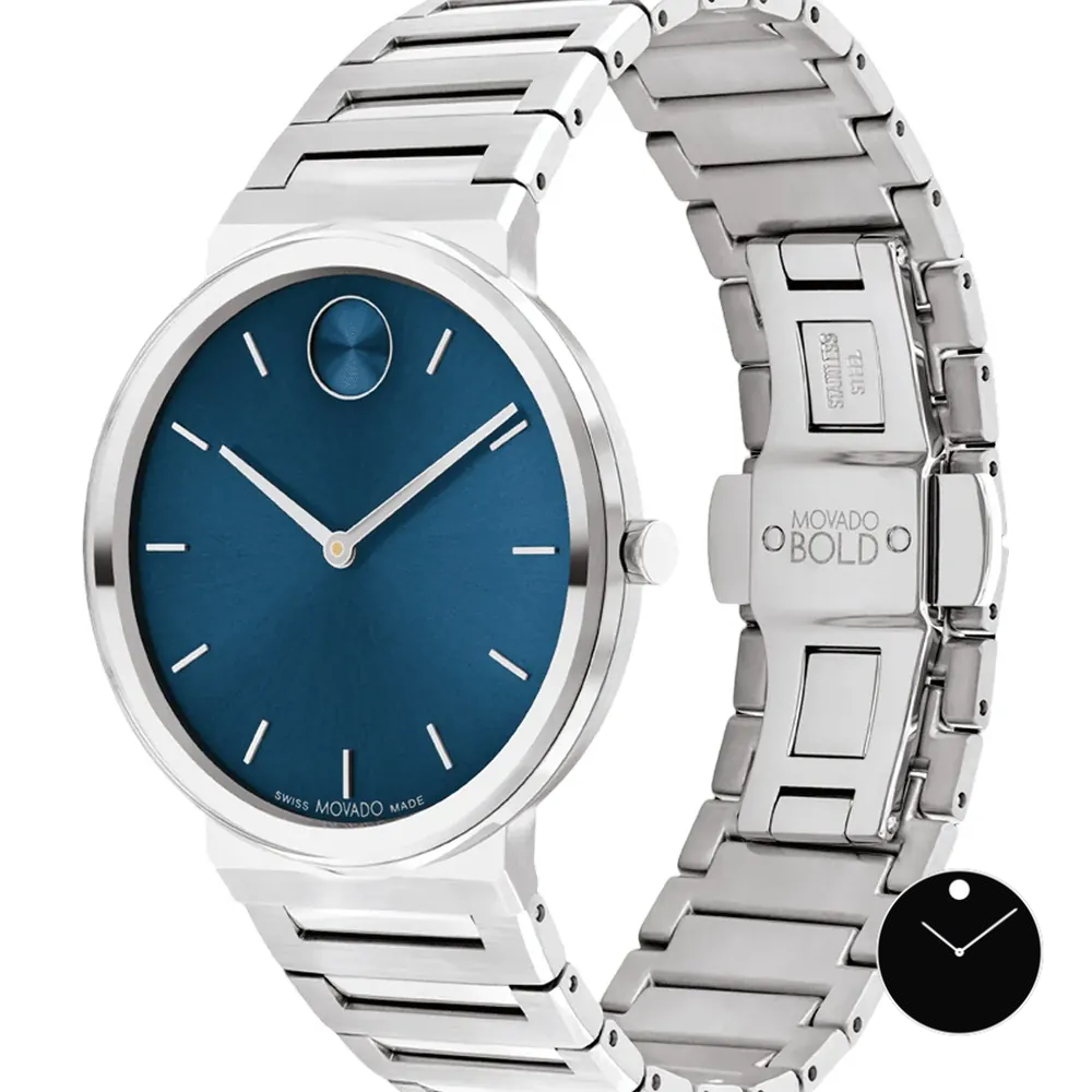 Thương hiệu Movado Loại Bold, Tên Bold Horizon, Sản xuất tại Thụy Sĩ Có, Khả năng chống nước 3 Bar, Màu mặt số Xanh lam, Màu kim (h-m-s) Bạc, Bạc, Thông tin vỏ, Đường kính 40 mm, Chất liệu vỏ Thép không gỉ, Hình dạng vỏ Tròn, Màu vỏ Bạc, Chất liệu vỏ sau Thép không gỉ, Nắp đậy vỏ sau, Chất liệu pha lê Sapphire, Núm vặn, Thông tin dây đeo, Chất liệu dây đeo Kim loại, Loại vật liệu Thép không gỉ, Màu dây đeo Bạc, Kiểu khóa Khóa bướm vô hình, Kiểu gắn Chốt thép.