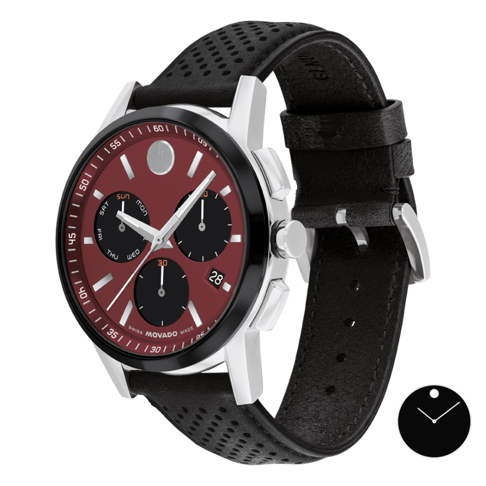Museum Sport giới thiệu một chiếc đồng hồ bấm giờ tối giản thể thao cho thiết kế mang tính biểu tượng nhất của chúng tôi. Chiếc đồng hồ bấm giờ 43mm này có mặt số có họa tiết màu đỏ tía, điểm nhấn Swiss Super-LumiNova® và dấu chấm đặc trưng của chúng tôi ở vị trí 12 giờ. Mặt số màu đỏ với vạch chỉ giờ, Đường kính vỏ 43, Chất liệu vỏ thép không gỉ và thép không gỉ hoàn thiện bằng PVD màu đen, Pha lê Chế tạo Sapphire, Khả năng chống nước 30 mét, Bộ máy Bộ máy bấm giờ thạch anh Thụy Sĩ, Dành cho nam, Dây đeo bằng da bê màu đen.