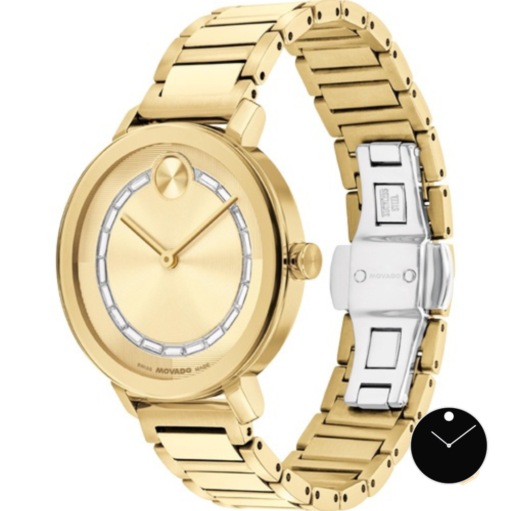 Kể từ khi thành lập vào năm 1881, Movado đã đạt được di sản về sự đổi mới trong thiết kế đồng hồ. Nổi bật với các thiết kế sáng tạo và bộ sưu tập hiện đại của Movado. Nổi tiếng nhất với chiếc đồng hồ Museum Watch. Movado có nghĩa là "luôn chuyển động" trong tiếng Esperanto. Những chiếc đồng hồ này nổi tiếng với chấm kim loại đặc trưng ở vị trí 12 giờ và phong cách tối giản. Dây đeo và vỏ bằng thép không gỉ IP light gold, Mặt số bằng thép vàng, Khóa cài bằng nút bấm, Bộ máy thạch anh analog, Đường kính vỏ xấp xỉ 34mm, Độ dày vỏ xấp xỉ 7,35mm, Khả năng chống nước 3A, Sản xuất tại Thụy Sĩ